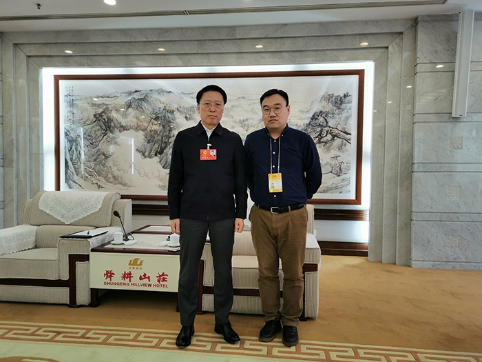 山东省“两会”期间,山东省人大代表、淄博市委书记江敦涛(左)接受了澎湃新闻的专访。