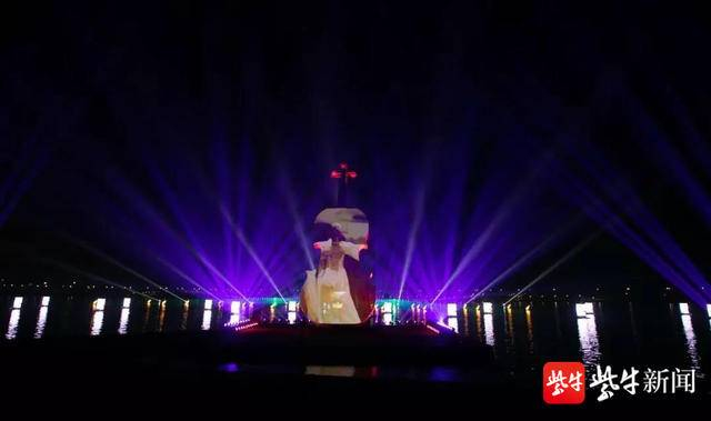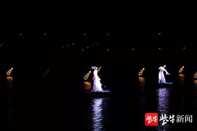 在城水相依的美景中呈现一场梦幻唯美的空间光影音乐会,此次演出的呈现手法别具一格,整场演出将故事内容投放在巨大的小提琴装置上,同时,作为主视觉载体,小提琴装置的移动变化引人注目;66条无人船搭载着冰屏、光束灯、激光灯,以不同的编队造型出现在舞台后方的水面上,灵动而震撼;讲述者带领观众走入悠悠岁月中,舞蹈演员以海棠仙子的形象在舞台前区翩然起舞……各个元素的结合,构成一台融合多种表现形式的交响,一台文化科技结合的交响,一台诉说海棠思念的交响,一台光影乐团异彩纷呈的交响。
