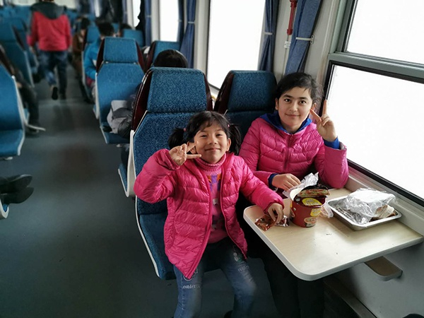 眼下,春节在即,不少放假的大学生和返乡农民工陆续回家。虽然南疆线路相较以往已增设不少,但7556次列车仍旧趟趟满员。这趟穿行于沙漠边缘的列车里坐满了返乡、赶巴扎的乘客,十分热闹。“学生票半价便宜,最近每趟车都满员,其中90%都是放假回家的学生。”普拉提称。
