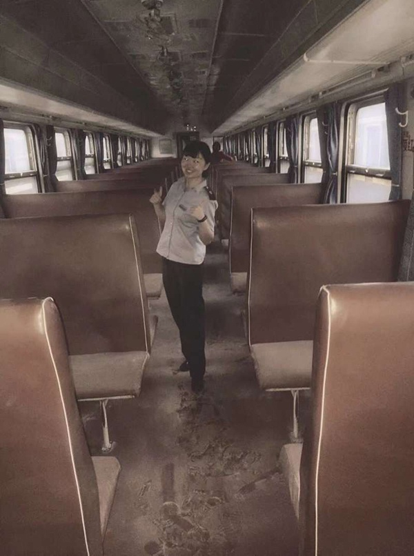 老式绿皮车时代,7556列车经过风沙区后,车厢内常常积满沙子。 本文图片均为受访者提供