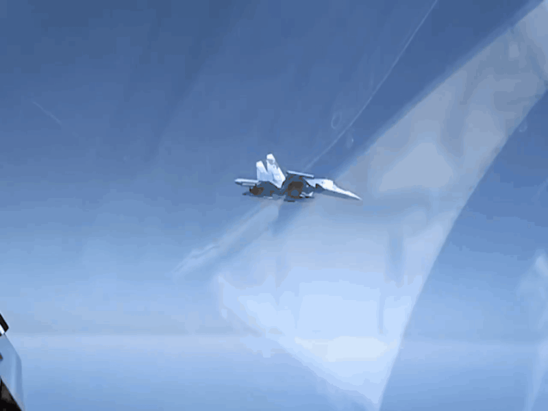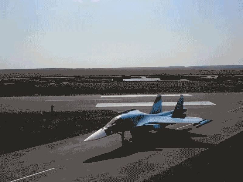 油料及弹药补充完毕后,多架苏-34战机依次沿公路起飞,继续飞向预定任务区域。图为苏-34在公路着陆瞬间。