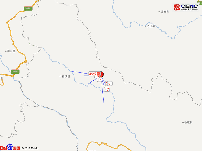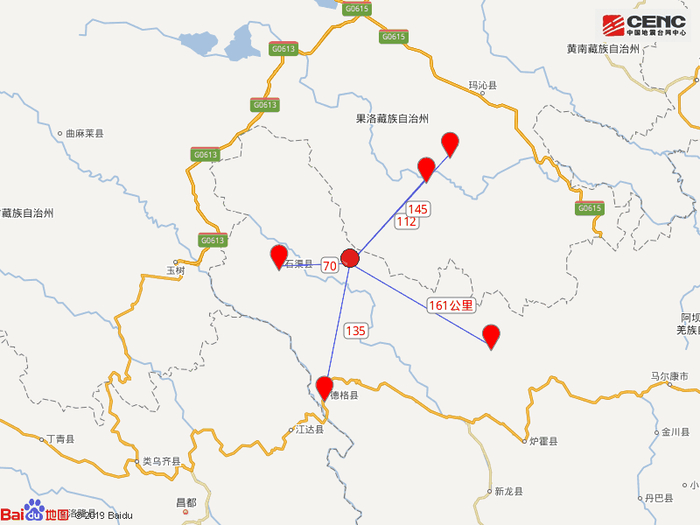 周边县城:震中距石渠县70公里、距青海达日县112公里、距德格县135公里、距青海甘德县145公里、距色达县161公里,距青海玉树藏族自治州172公里,距西宁市484公里。