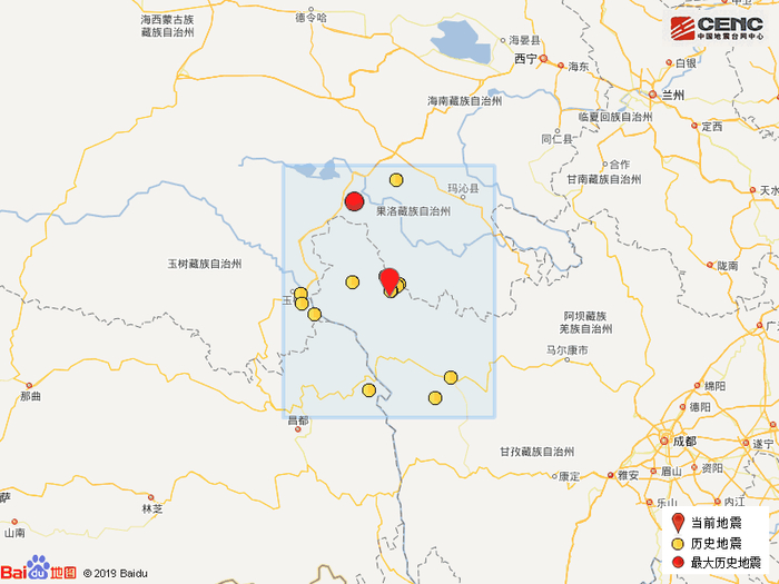历史地震:根据中国地震台网速报目录,震中周边200公里内近5年来发生3级以上地震共15次,最大地震是2015年10月12日在青海省果洛藏族自治州玛多县发生的5.2级地震(距离本次震中163公里),历史地震分布如图。