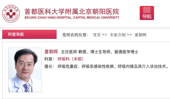据朝阳医院官网介绍,童朝晖教授擅长呼吸危重症、呼吸系感染性疾病、呼吸内镜及其介入诊治技术。