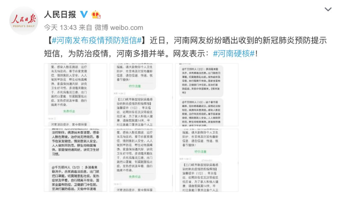 今天,人民日报官方微博转发了一组“河南发布疫情预防短信”的截图,引来几十万点赞。事实上,河南省在这次抗击新型冠状病毒感染的肺炎中的做法,已经成为微博的热门话题,“河南硬核”成为微博标签,不少网友喊话“到河南抄作业”。