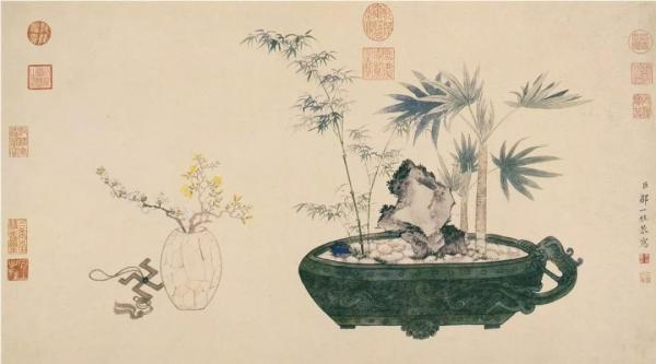 乾隆时期的词臣邹一桂(1686—1772)所作的《画盎然生意》,图绘的是仿古铜盆内平铺小碎石,植栽棕榈、文竹与湖石,旁边配有仿哥窑花瓶,内插山礬和迎春花,旁有万字锦春结饰,具有“万福集聚”的涵义。邹一桂在《小山画谱》中谈到花卉画法时提到须“知天”,即关注节令。