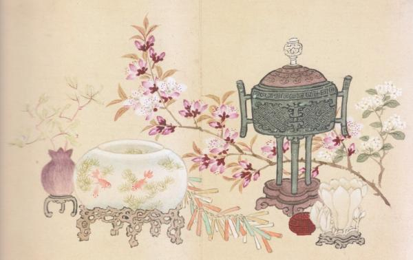 人们在“岁朝清供”画中时常能观赏到宫廷的内造器物,传为元人的《丰登报喜图》就是一例。画中一件镂空的双层玲珑转心套瓶内,插着白梅、天竹,花间悬挂香囊、玉磬。黑漆彩绘几架上置有铜香炉,珐琅瓶内则有香箸,另有玉兰花插一件。前方果盘盛满百合、柿子、苹果、佛手,旁置柏枝与柿、灵芝与细颈玻璃瓶,运用同音和谐音,表达“百事平安,福气吉祥”之意,可能是清代中晚期宫廷画家所作。该画对器物的表现精细程度超过了花卉果蔬,显出一派宫廷富贵气象。另乾隆时期画家蕫诰(1740—1818)曾画《碧桃金鱼》,其中有碧桃、爆竹、金鱼、炉、盒和石榴瓶,意为多子多福,岁岁平安,金玉满堂。在画面右下角也出现了玉兰花插,可见是当时流行的宫廷供器。
