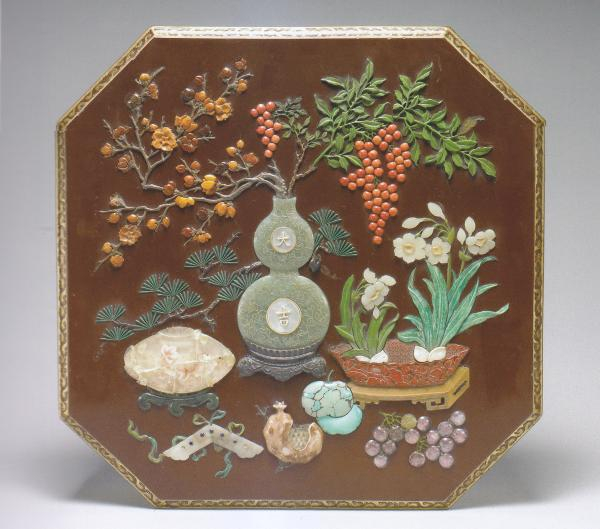 清代,嵌玉石博古图八方漆盒(盒盖),18,19世纪,宽39.5厘米,盒高11.1厘米,台北故宫博物院藏。