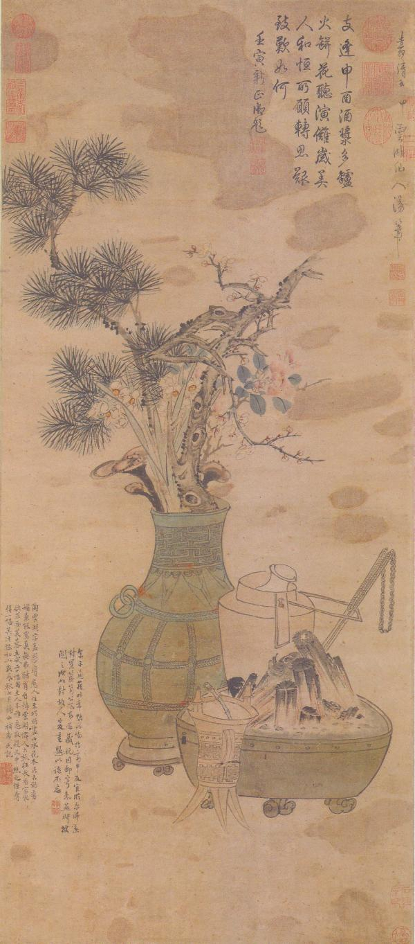 高濂(生卒年不详)曾言道:“大古尊罍”适合摆放“堂中插花”。晚明陈洪绶(1598—1652)名下的《清供图》,其中的玉杯形状,与藏于台北故宫博物院的晚明螭把玉盃颇为相似,是当时流行的清供器物。张宏(1577—1652后)的《岁朝图》中出现了青铜觚、铜炭盆、提梁卣等古器,是他除夕摹友人的收藏而成。另有一件传成化年间(1465—1487)画家陶成所作,款为“嘉靖壬申云湖仙人漫笔”(嘉靖朝无壬申年)的《岁朝图》,也出现了炭盆和提梁卣,还有一爵,一铜罍和拨火箸,罍中插柏枝、水仙、老梅、山茶和灵芝,时代应为明末或其后。