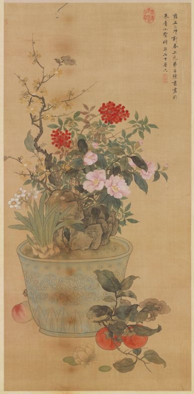 钤印“陈书”朱文连珠印。画中腊梅、山茶。南天竹、水仙,经过整形修剪,按照高低比例栽种于天蓝釉瓷盆中,并配有湖石。其下放置百合、柿子、苹果、灵芝、橄榄,寓意“百事如意”。花卉蔬果都是冬令时物,显现出浓郁的岁朝气息。