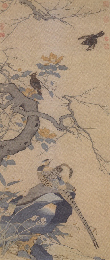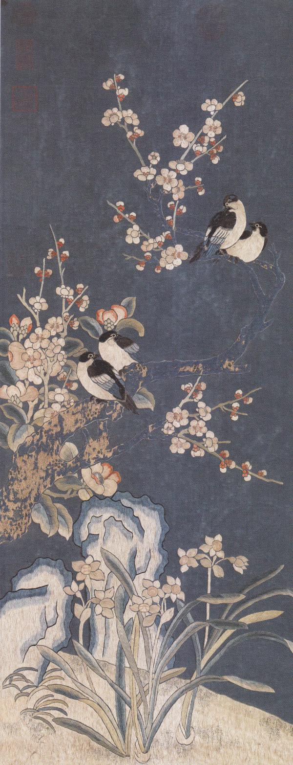 宋代,《宋缂丝岁朝花鸟》,绢本设色,166.5X71.5厘米,台北故宫博物院藏。