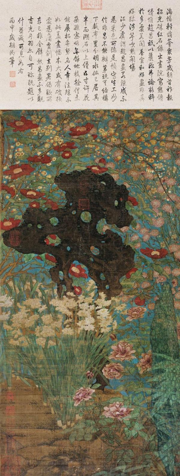 另一件被归于赵昌(11世纪)名下的《岁朝图》,画湖石和茂密的山茶、水仙、梅花和长春花,花卉之下再用石青填底,显得富丽多采。其构图特殊,画面不留空地,极具装饰的效果。北宋郭若虚(生卒年不详)的《图画见闻志》卷六中提及,南唐宫廷中有被称为“铺殿花”的画作,为宫院挂设之具,画丛艳叠石,傍出药苗,杂以禽鸟蜂蝉之妙。另位置端庄,骈罗整肃,多不取生意自然之态。而此幅作品的构图命意似乎正与之相吻合。但该画虽有“臣昌”款两处,但并非其原作,时代也晚于赵昌,之所以被认为是“岁朝图”,可能是因为画中的主花采用了岁朝时令的水仙与山茶。