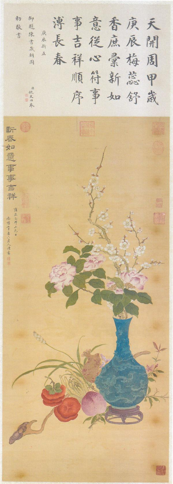陈书的另一件《岁朝吉祥如意》,作于雍正乙卯(1735)新春上元节。画中有一孔雀蓝釉行龙长颈瓶,其中插有红梅、茶花,旁边摆放了柿子、石榴、桃子、灵芝、佛手及桃花,呈现春暖花开的景象,也有事事如意,福寿双全的涵义。但石榴和桃子都并非节令水果,当于乾隆御笔岁朝图中的牡丹一样,为衬托欢乐丰富场面所画。款书: