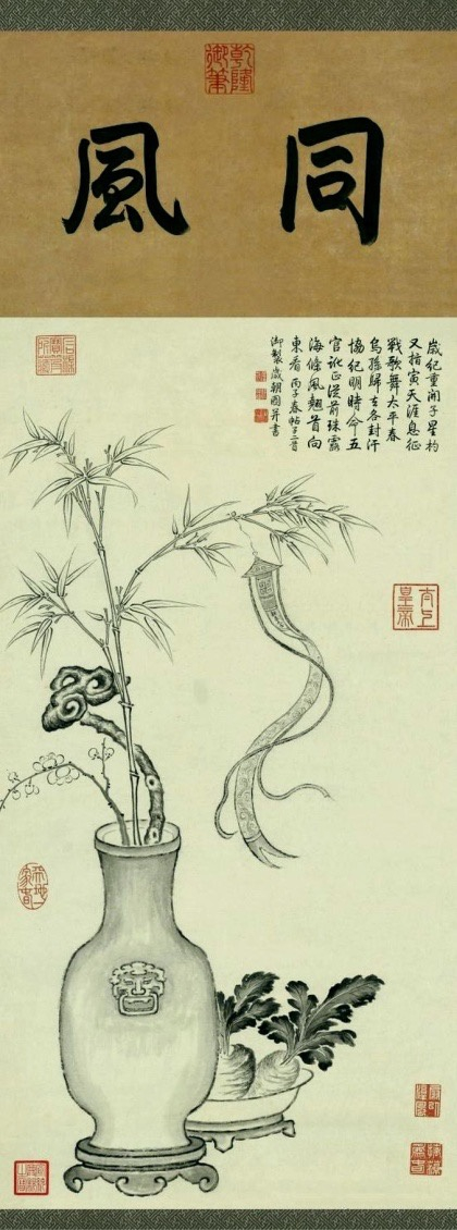 如《弘历御笔丙子岁朝图》,作于清乾隆二十一年(1756年),是年弘历四十五岁。诗塘上题“同风”二字,画中绘有瓶、竹、灵芝、萝卜、“新春大吉”条幡,运笔墨色浓淡间颇有意趣,题诗曰: