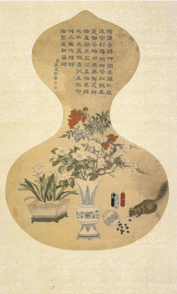 《乾隆缂丝岁朝图》,在葫芦造型内设计岁朝清供图,以古器物加上花卉组合而成。敞口仿古铜器方觚造型的青瓷花瓶,内插梅花、茶花、天竺,左侧另有水仙盆栽,并配置爆竹,以及出现了一只捡起瓜子的松鼠,一派浓郁的新春画意。上方则有乾隆、嘉庆朝的词臣姜晟(1730—1810)书写御制诗文一首,并用蓝色缂丝制作。曰: