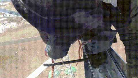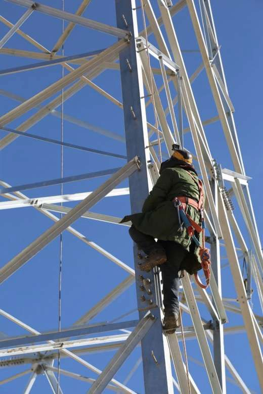 塔上的积雪刚刚融化,李友兵就和工友们赶到施工现场,系好安全带,爬上N448号铁塔,完成最后一部分的安装。为了保证进度,青海至河南特高压工程冬季继续施工。每次上塔,李友兵至少要在零下二十多度的塔上呆三、四个小时。