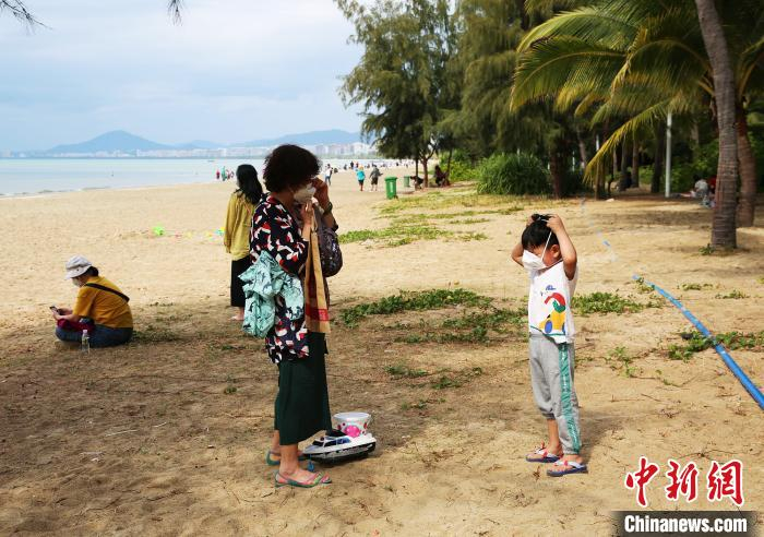 记者连日来在三亚湾海边看到,不少游客戴上了各式防护口罩。看到戴口罩的人越来越多,一位年轻的母亲从包里翻出口罩,“威逼利诱”给孩子带上。