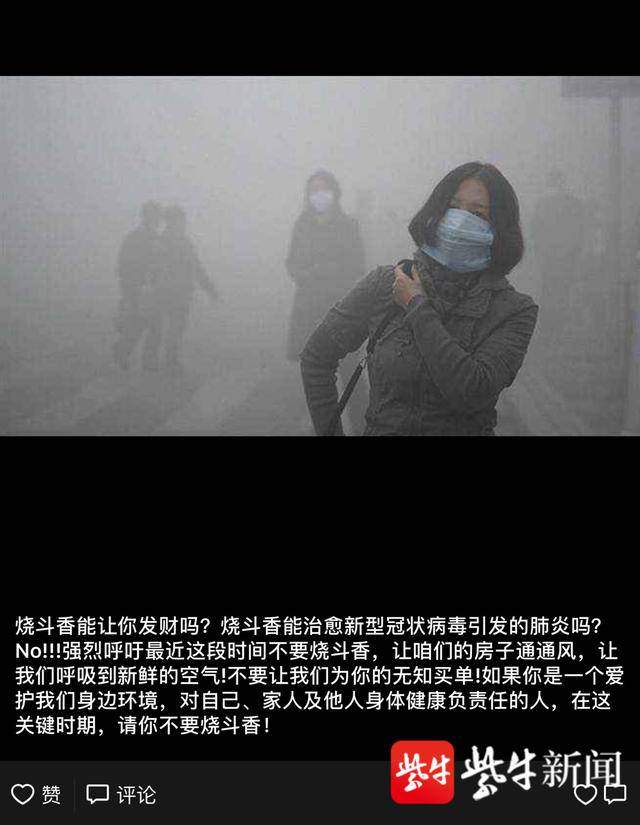 “烧斗香能治愈新型冠状病毒引发的肺炎吗?No!强烈呼吁最近这段时间不要烧斗香,让咱们的房子通通风,让我们呼吸到新鲜的空气。如果你是一个爱护环境,对自己、家人和他人身体健康负责任的人,在这关键时期,请你不要烧斗香!”高邮市城北中学英语老师蒋朝春,在自己的微信朋友圈发了这样的文字。