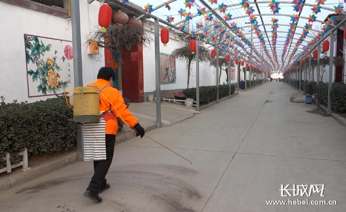 村里街道上喷洒消毒液。长城新媒体记者 周亚彬 摄