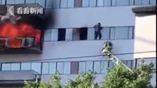 社交媒体上流传的一段视频显示,一位居民爬出阳台,紧紧抓住窄窄的边框,在外墙上艰难行走,试图离火海远一点。消防员站在加长的云梯上试图将他救出。