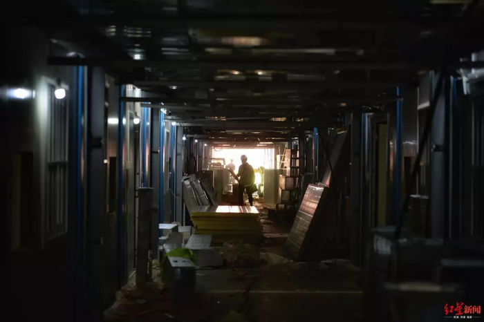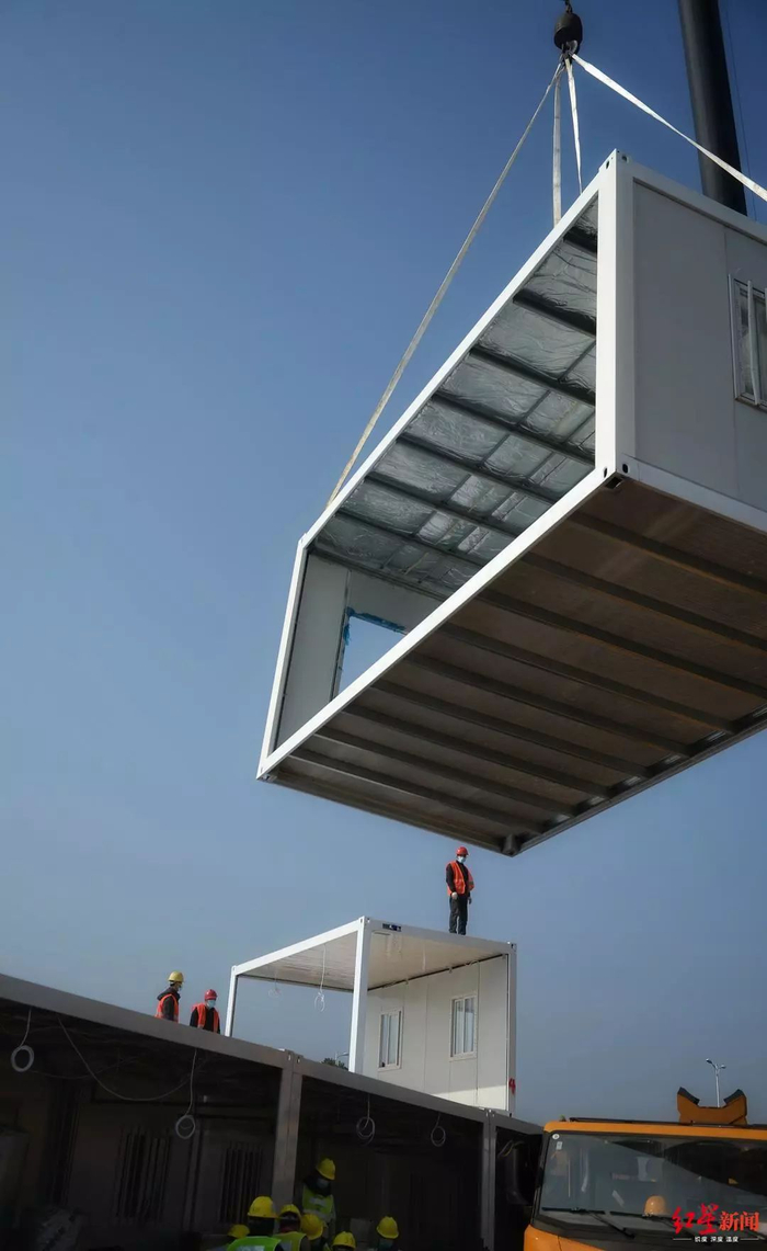 还有四川大英的一家供货企业,在除夕接通知后,随即召回了工人加紧生产,并先后两次向武汉发货,提供了一百余套厢式房屋。就在王俊抵达的当天,一栋双层病房区钢结构搭建起来。第二日,300多个箱式板房骨架完成了安装,场外的板房拼装正紧张进行。来自外地的大量建材运抵。