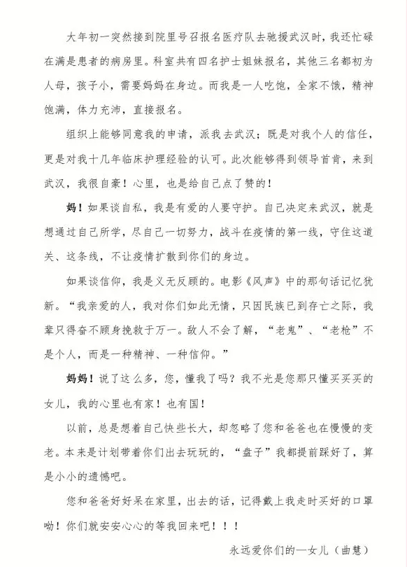 “我已顺利到达武汉,一切都好,勿念!”在顺利到达武汉后,她给自己的母亲写了一封家书。其中写道:“妈!如果谈自私,我是有爱的人要守护。自己决定来武汉,就是想通过自己所学,尽自己一切努力,战斗在疫情的第一线,守住这道关、这条线,不让疫情扩散到你们的身边。”