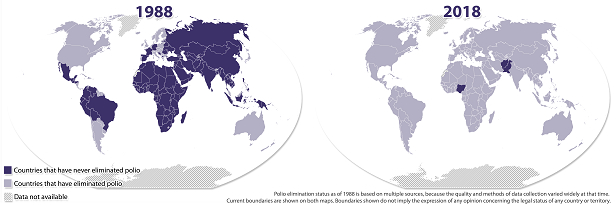 其实,1988年开始由世界卫生组织(WHO),联合国儿童基金会(UNICEF)和扶轮基金会(Rotary Foundation)领导的一项公共卫生工作,以永久性消除世界各地的所有脊髓灰质炎感染病例。这些组织与美国疾病控制与预防中心(CDC)和盖茨基金会一起,通过全球根除脊髓灰质炎行动(GPEI,Global Polio Eradication Initiative)率先开展了这项运动。在此之前,人类已经成功消灭了两种传染病——人类传染病天花和动物传染病牛瘟。