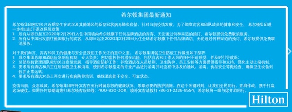 近日,希尔顿集团官方网站声明,即日起至2020年2月29日,所有入住中国境内希尔顿旗下任何品牌酒店的旅客,或是从中国出发前往他国旅行的宾客,无论是通过何种渠道预订,都可以免费取消预订。若是从第三方平台预订,可直接联系平台取消。