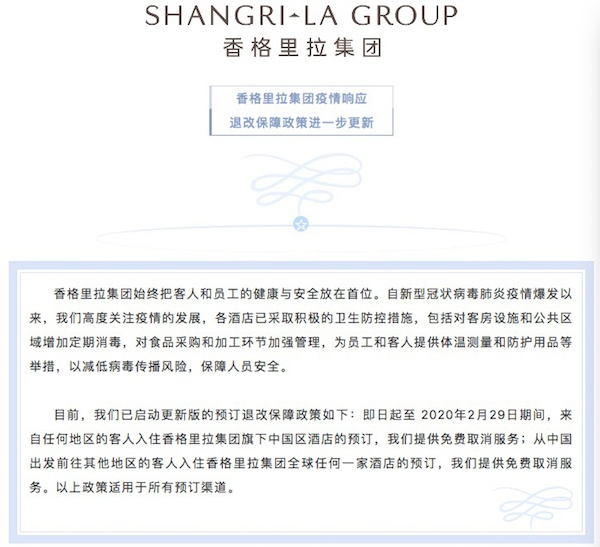 2月1日,香格里拉酒店集团微信公众号声明,即日起至2020年2月29日期间,来自任何地区的客人在香格里拉集团旗下中国区酒店的预订都可以免费取消;从中国出发前往其他地区的客人可以免费取消香格里拉酒店集团全球任何一家酒店的预订。以上政策适用于所有预订渠道。