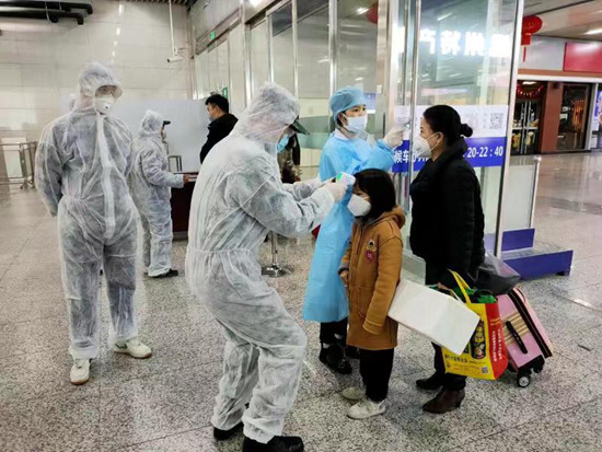 温州成为疫情“重灾区”。温州各级团组织积极发动团员青年、青年志愿者参与防疫抗疫,至今有180家志愿服务组织的近6000名青年志愿者参与到武汉及周边地区来温人员的排查工作中,他们协助运管、交警、卫健、高速管理等部门,对来往车辆进行防疫检测。图为青年志愿者在温州南高铁站进行防疫检测。每天早上7点到晚上11点,志愿者一直忙碌在检测点,协助旅客做好安全防护,严密监测来往车辆和人员。郑欣欣/摄