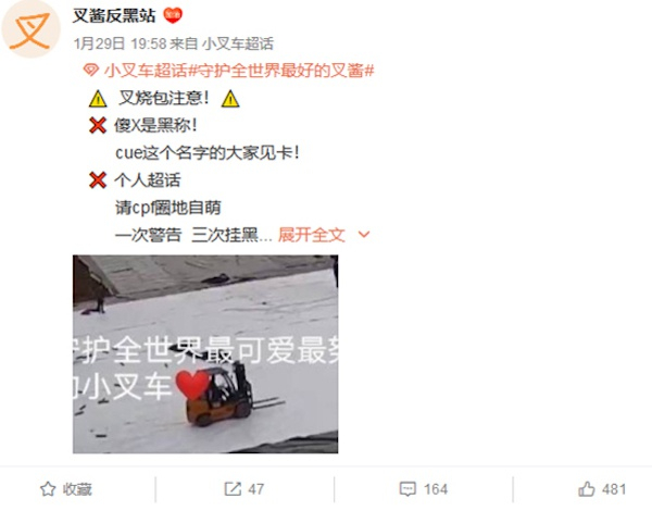 在疫情时期,萌的三架马车依然行驶。以“叉酱反黑站”为例,这个自发迷群和偶像粉丝群无异,拥有自己的粉丝群体自称“叉烧包”,甚至还创作了叉车拟人玩偶形象并试图进行商品化活动,集二次元、偶像及消费主义三位一体,是较具有典型性的“萌”时代行为。