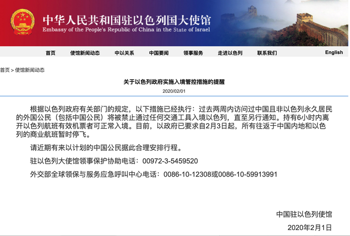 2月1日,中华人民共和国驻以色列国大使馆发布《关于以色列政府实施入境管控措施的提醒》称,根据以色列政府有关部门的规定,以下措施已经执行:过去两周内访问过中国且非以色列永久居民的外国公民(包括中国公民)将被禁止通过任何交通工具入境以色列,直至另行通知。持有6小时内离开以色列航班有效机票者可正常入境。目前,以政府已要求自2月3日起,所有往返于中国内地和以色列的商业航班暂时停飞。