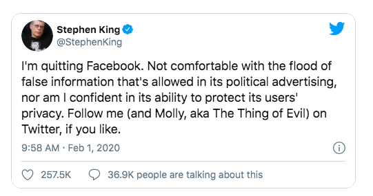 史蒂芬·金指出,脸书在政治广告和隐私方面的举措是他离开的原因。他表示人们可以继续在推特上关注他。去年,推特宣布将不做政治广告,这与脸书形成了鲜明的对比。长久以来,金一直利用推特来表达自己的政治观点,最近他又在推特上宣布他对马萨诸塞州民主党参议员伊丽莎白·沃伦(Elizabeth Warren)的支持。“我将支持并为任何赢得提名的民主党人工作,但我支持伊丽莎白·沃伦,”他写道,“我希望看到她在辩论中把特朗普驳得体无完肤。”