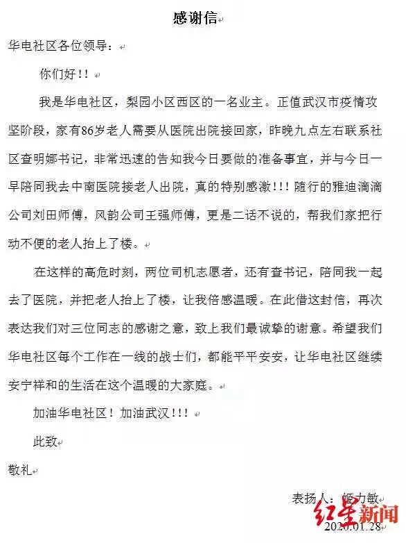 1月28日,一封感谢信寄到了华电社区。写信的人是该社区一小区业主姬力敏。信中说,“正值武汉市疫情攻坚阶段,家有86岁老人需要从医院出院接回家……在这样的高危时刻,两位司机志愿者,陪同我一起去了医院,并把老人抬上了楼,让我倍感温暖。”