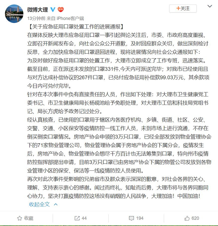 2月6日下午,大理市召开新闻发布会,大理市应对新型冠状病毒感染肺炎疫情工作指挥部发布通报称,此前,大理市在货物检查中对随车手续不全的口罩进行了暂扣,对全部暂扣的598箱口罩进行有偿应急征用。通报称,对于前期暂扣口罩一事,我们诚恳的向社会各方表示道歉,对造成的影响进行深深的反思与检讨,对相关人员将进行严肃处理,恳请各方给予谅解。