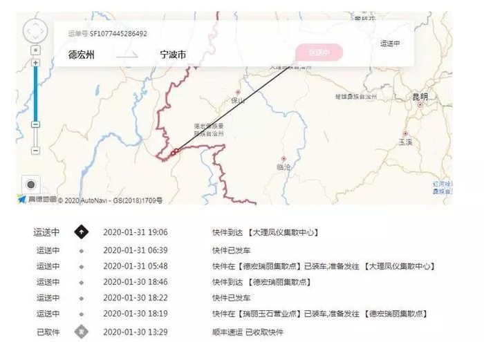 记者通过顺丰单号查询,快件1月30日收件,第二天晚上7点06分到了大理凤仪集散中心,此后再无动静。