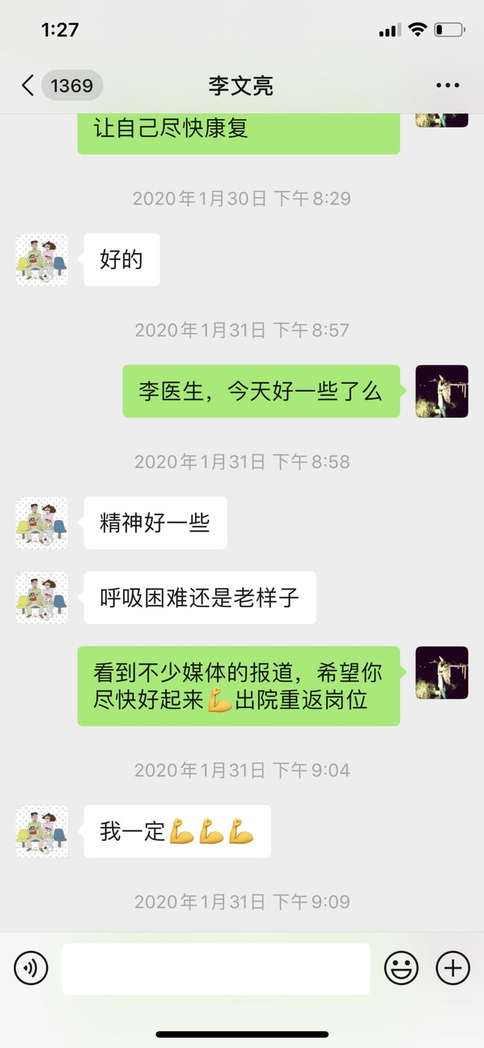 “精神好一些”“呼吸困难,还是老样子”,当时,尚在重症监护病房的李文亮一直不时和记者交流自己的情况。他告诉红星新闻记者,此前尽管已经很注意了,但父母也受到了感染,他怀疑是自己传染的。后来他自己的病情加重,艰难地开始抗生素、抗病毒、护胃和高流量吸氧的治疗过程。