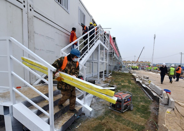 1月30日,在小汤山医院,工人在实施修缮改造。
