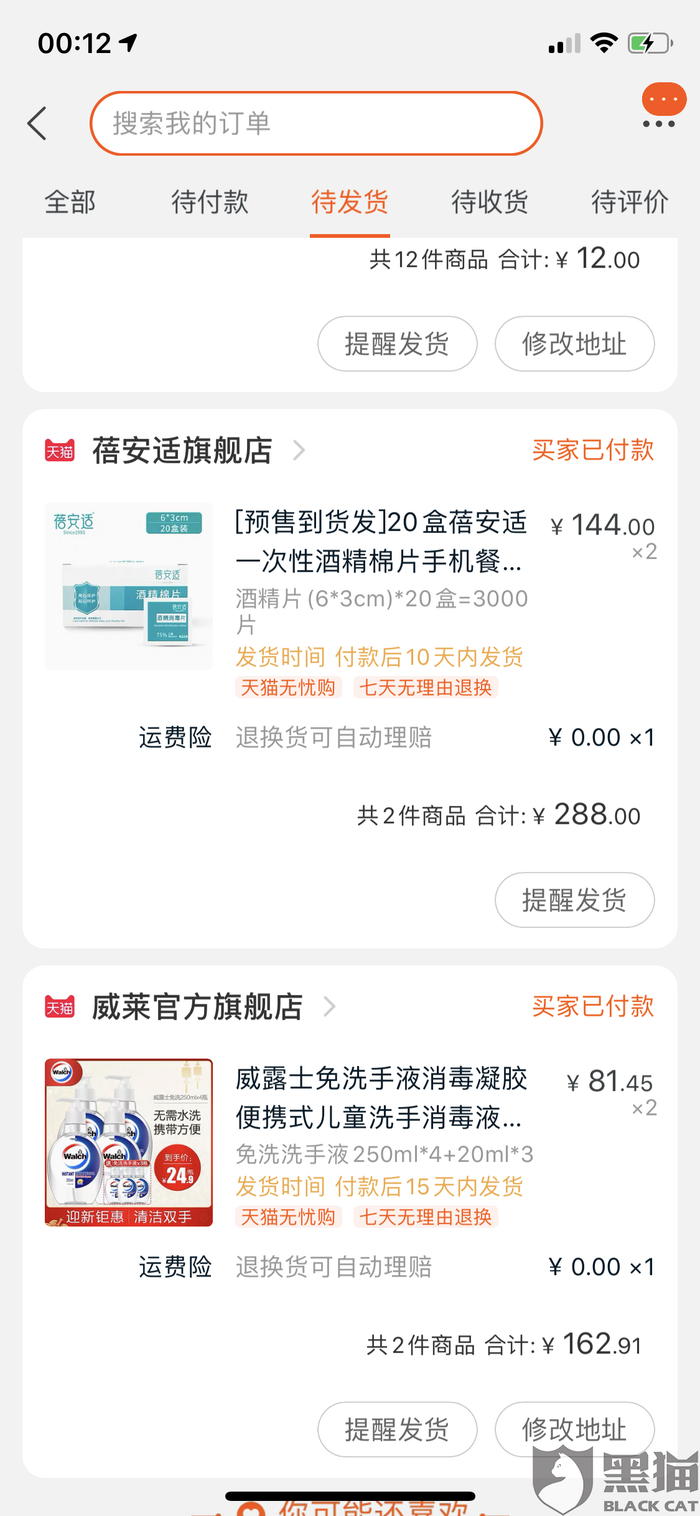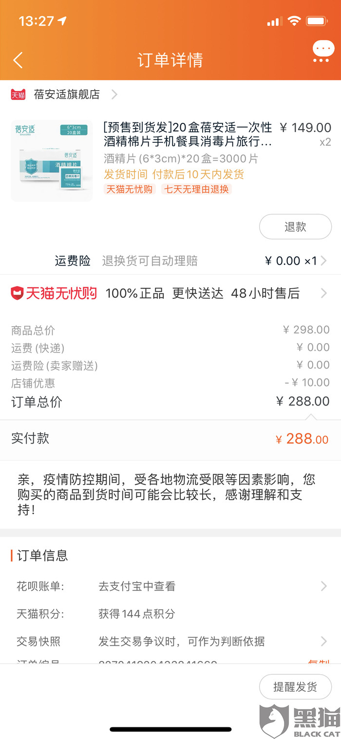 黑猫投诉:商家疫情严重期间酒精棉片价格翻n倍欺诈消费者拒不发货 发国难财