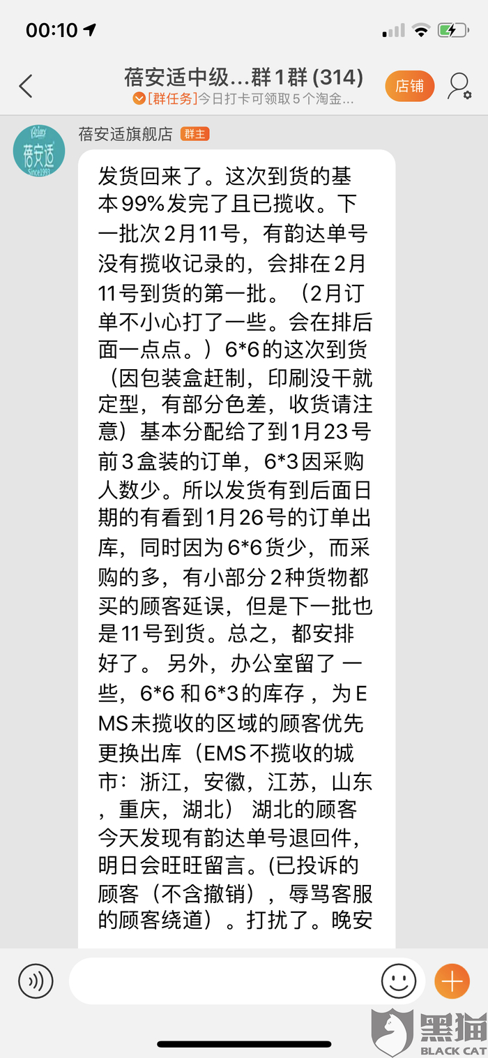消费者“00ANNA00”在2月8日向黑猫投诉平台反映:“23日拍下的时候 6000片是288 现在已经涨价涨到306块3000片 翻了倍无数倍 客服N天联系不上,投诉无门 超10过10天还不发货 客服一直用机器人忽悠人 不回复还撒谎说22-24好没发货 朋友同样时期买的28号已经收到了 我的一直不发!说他们很忙很忙 但是一少补运费两分钟后就有人联系我 少补运费 要钱的时候有人 付完钱就不理人 也不发货 也不打招呼说一声什么时候发”