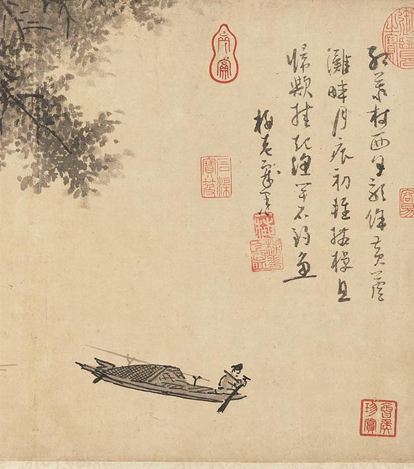 《芦滩钓艇图》自题一词:“红叶村西夕照馀。黄芦滩畔月痕初。轻拨棹,且归欤。挂起渔竿不钓”,并署名“梅老戏墨”,这或许也正是梅花道人所爱的水墨游戏,对于文人画家而言,渔夫也被作为自由的象征,“渔樵文化”也同官场形成对比。