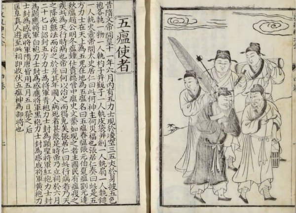 《三教搜神大全》的五瘟使者,以传播瘟疫作为要挟,向当朝的隋文帝索要封官赏赐