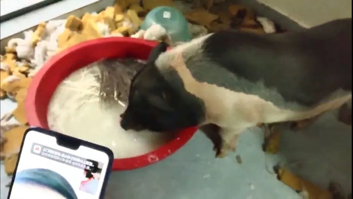 救援人员把水填满后,小香猪足足喝了大概5分钟的水。