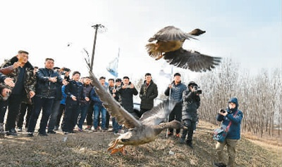 豫鲁两省志愿者放飞大雁 冉令杰摄