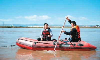 四川唐克水文站工作人员在白河水文断面测流 新华社记者 刘诗平摄
