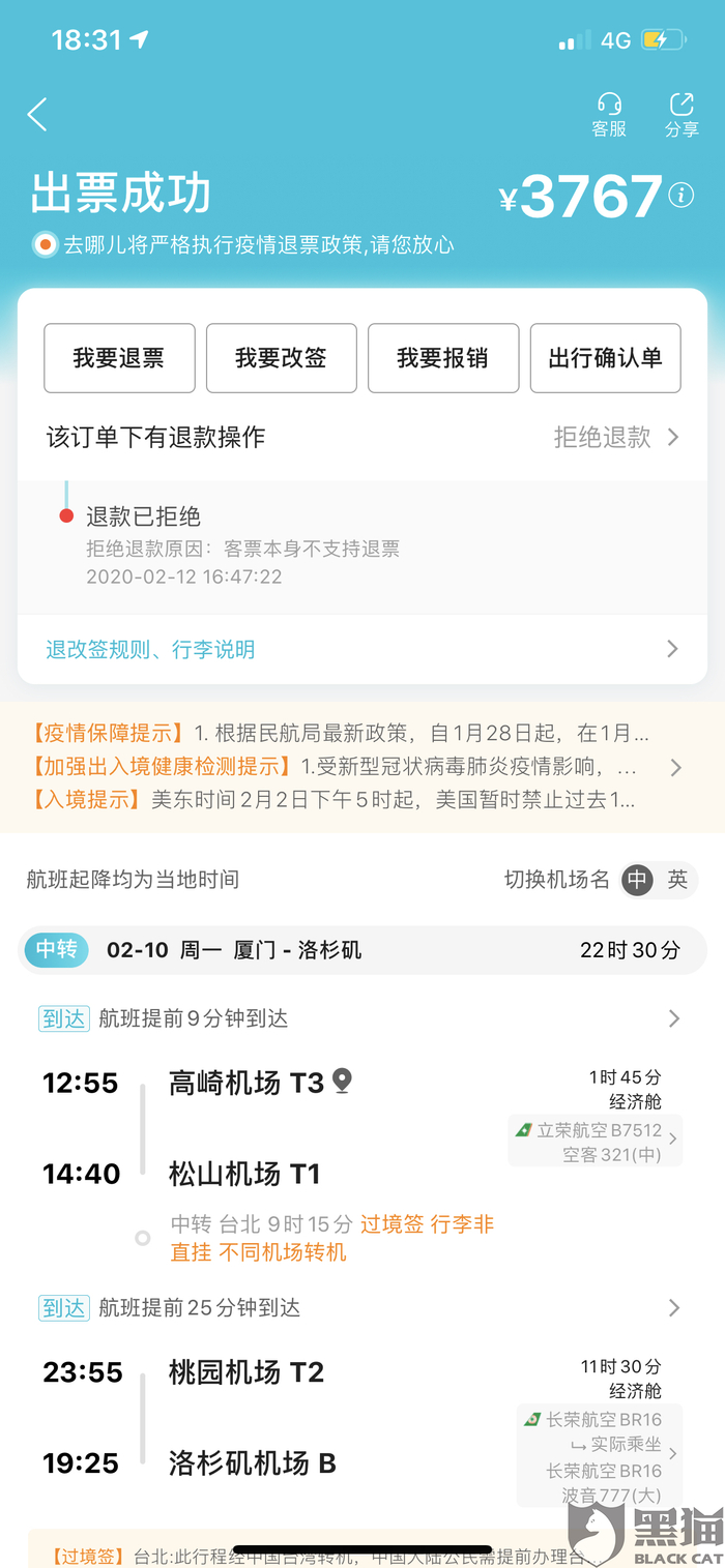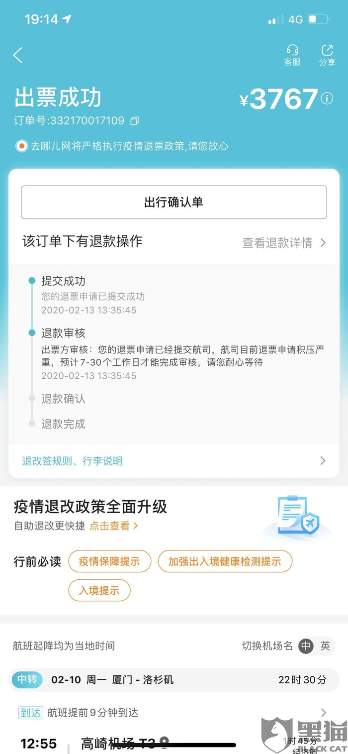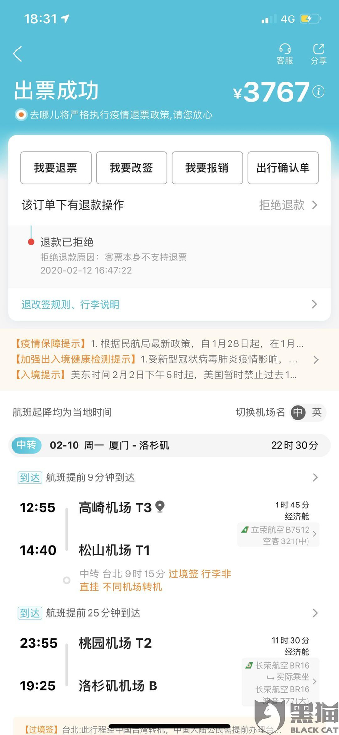 黑猫投诉:在去哪儿旅行app订的转机台北机票,无法入境台北申请免费退票,被驳回