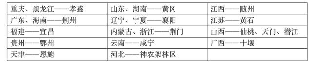 重庆与黑龙江共援孝感、山东与湖南共援黄冈、广东与海南共援荆州、辽宁与宁夏共援襄阳、内蒙古与浙江共援荆门。