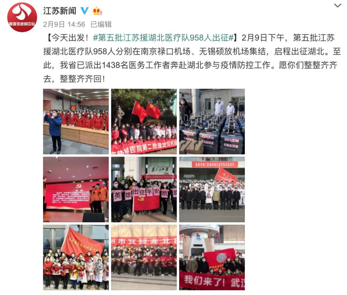 就在官方对口支援方案出炉的前一天,第五批江苏支援湖北医疗队958人分别从南京禄口机场、无锡硕放机场启程赶赴湖北,省委书记娄勤俭还专门到机场为白衣战士们壮行。
