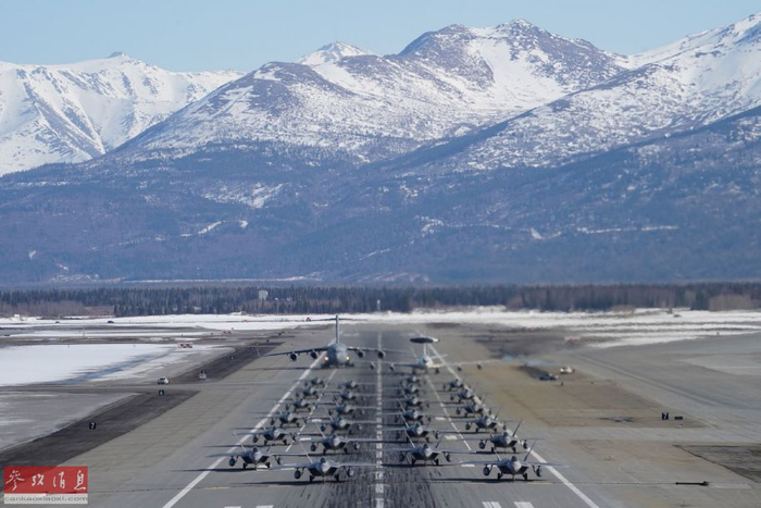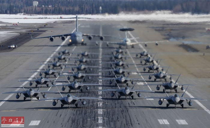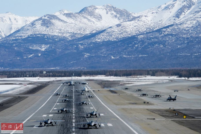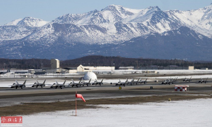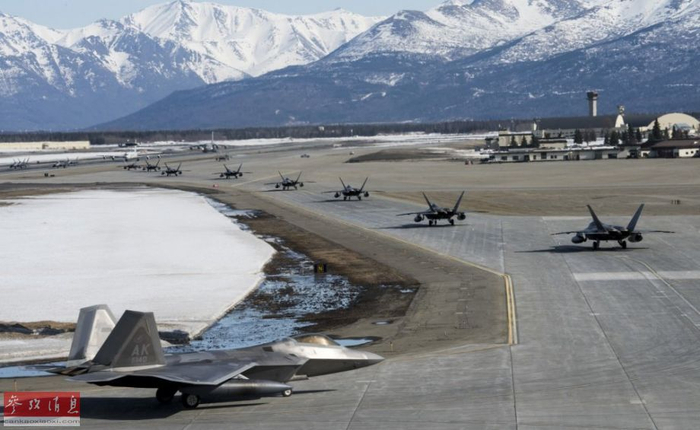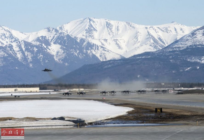 图中这架F-22,按垂尾编号判断属于美空军第3战斗机联队,AK则代表阿拉斯加州埃尔门多夫基地。