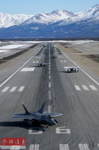 一侧滑行道还能看到其他几架F-22准备移入滑行道。